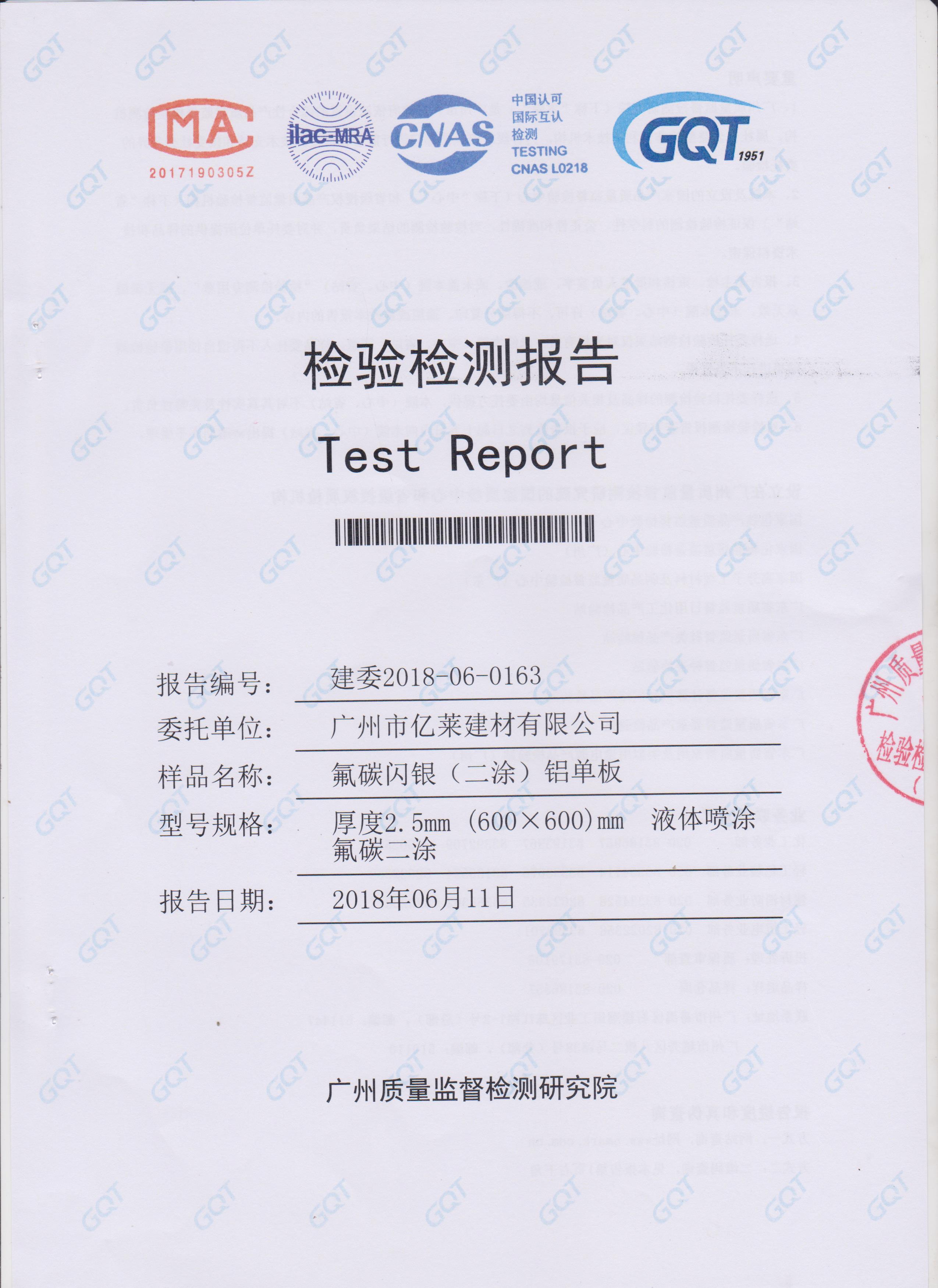 氟碳闪银铝单板检测报告
