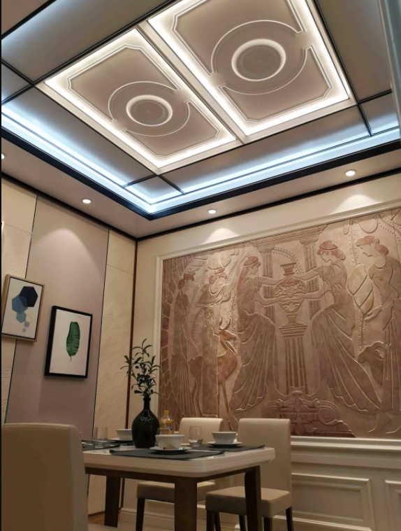 大规格安装,从视觉上给人一种延伸扩大的感觉,使空间更显开阔,成为不少别墅豪宅的首选。在产品设计上,大规格吊顶大板因为单片面积较大,可以承载的纹理设计元素更多,因此装修出来的整体空间纹理图案效果更加完整和立体,板面所体现的细节也更加丰富。