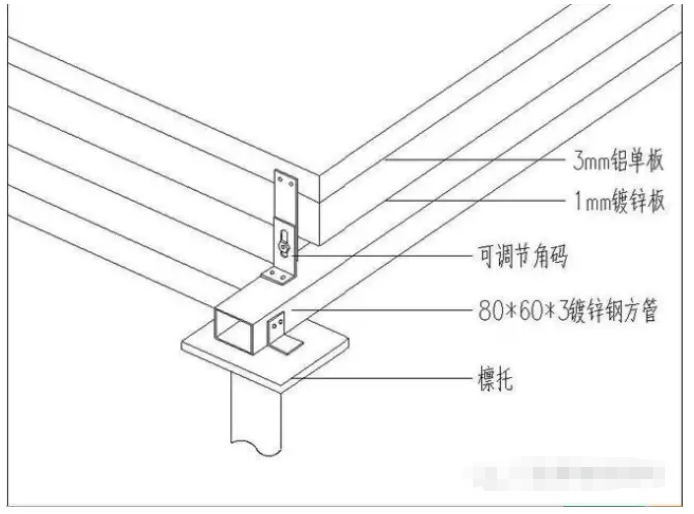 c、钢骨架的安装:主框采用80*60*3镀锌方钢管,确定基准面测量误差,调整横向、竖向、间距误差,焊接框架,焊接要牢固焊缝饱满,焊缝应打磨平整光滑;与连接件连接要牢固。